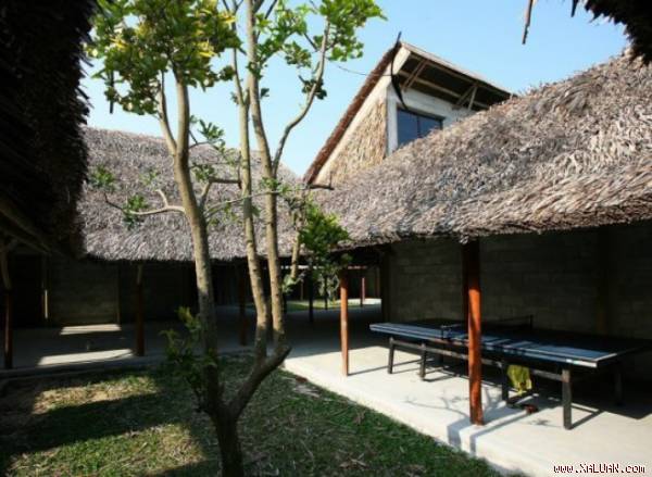 Hệ mái lá dừa, kết cấu khung tre, cột gỗ kiền kiền vững chắc. Tường bao xây gạch hai lớp không nung, tạo lớp đệm không khí, cách nhiệt, ngăn ồn.