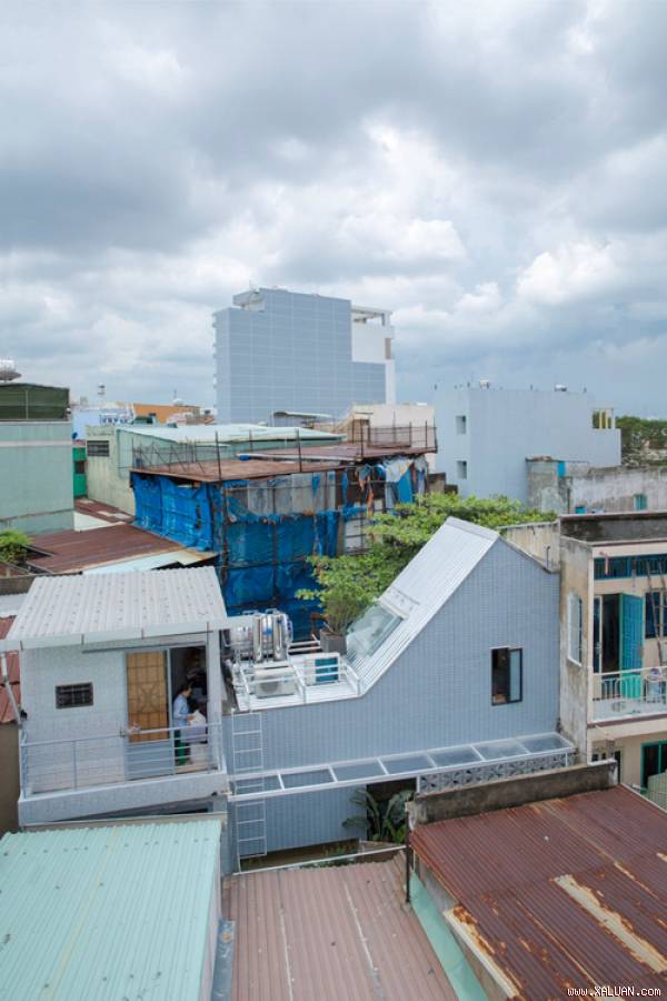 Hiệu ánh sáng kết hợp với các hộp trồng cây tự động tưới tiêu trên mái nhà mang lại ánh sáng cho tầng trên cũng như phòng ngủ của trẻ.